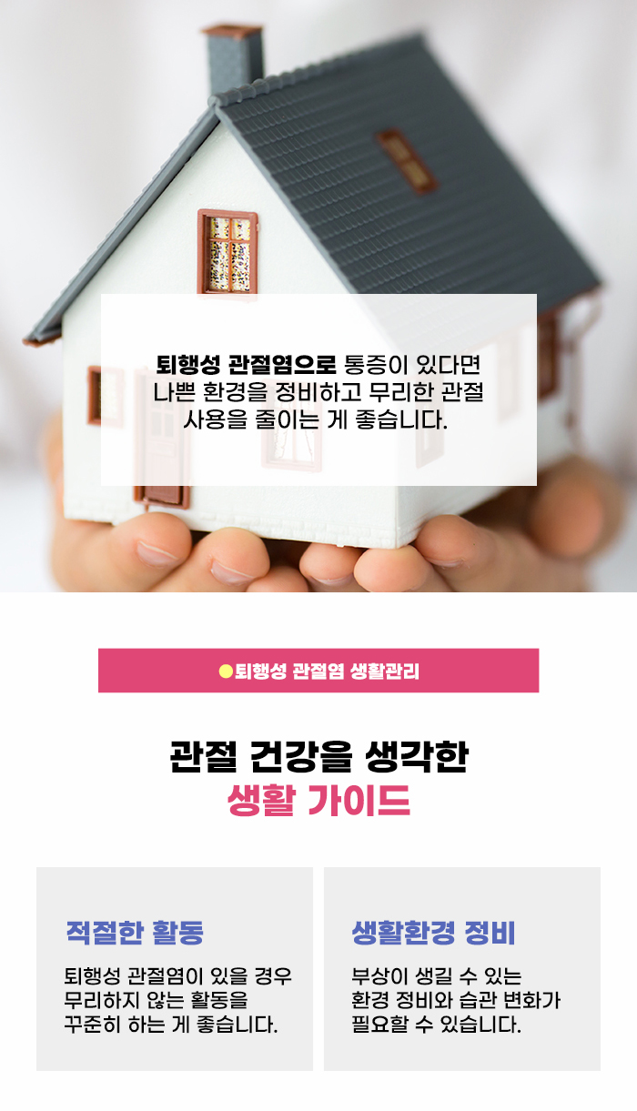 퇴행성 관절염은 남성보다 여성에게 더 많이 발견된다고 합니다. 이렇게 관절 통증이 생긴 경우 되도록 무리한 관절 사용과 활동을 줄여야 하는데요, 하지만 장기간 활동이 줄어들 경우 근육이 줄어들며 관절 부담도 커질 수 있습니다. 그렇기에 무리를 하지 않는 운동을 꾸준히 하며 관절 주변을 튼튼히 하는 것도 중요할 수 있습니다.