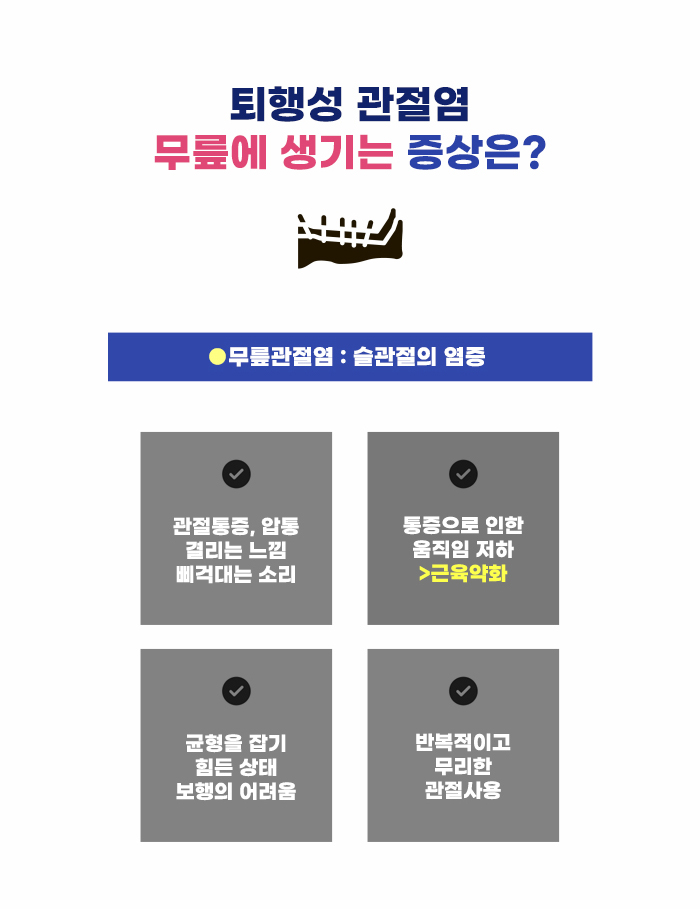 운동을 좋아하는 분 중에는 헬스를 하면서 근육을 키우고 원하는 몸매를 만들려고 하는 분도 있는데요. 근육은 운동을 꾸준히 하고 반복적인 손상과 회복을 통해 더 강해질 수 있고, 더 커질 수도 있습니다. 하지만 관절 부위의 연골은 그렇지 않은데요, 운동을 하면서 관절을 사용할수록 연골이 닳고 약해질 수 있습니다. 퇴행성 관절염은 점진적으로 연골이 소실되며 관절 부위에 손상, 염증이 발생한 것을 말합니다.