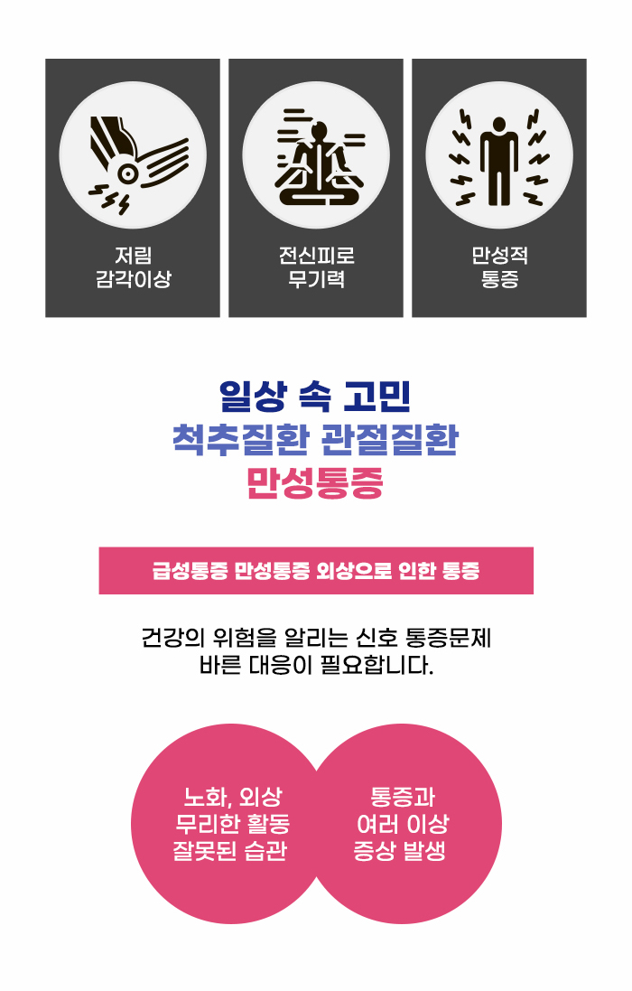 나의 몸에 이상이 있다는 것을 아는 게 건강을 지키기 위한 중요한 첫 단계입니다. 그렇기에 통증은 사람의 삶을 지켜주는 중요한 파수꾼이기도 한데요, 눈에 보이는 상처가 생기게 되었을 때, 겉으로 드러나는 피부에 이상이 나타났을 때는 몸에 문제가 있다는 것을 알기 쉽습니다. 하지만 겉으로 보이지 않는 이상이 생기고, 몸 내부의 이상이 진행되고 있을 때는 사실 문제를 알기 어려운데요.