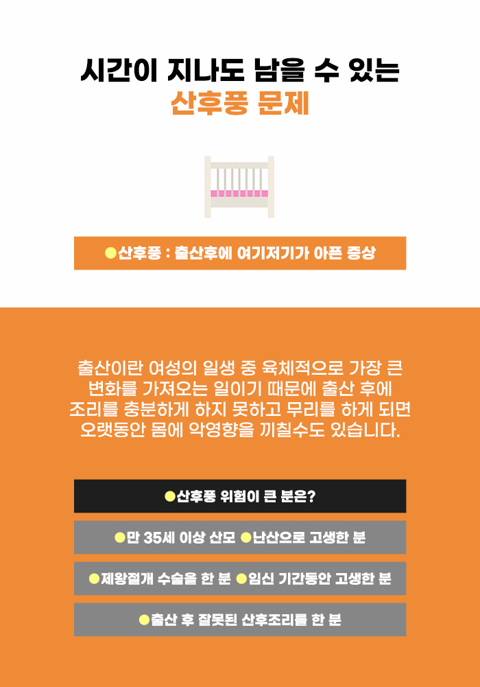 임신 기간 동안 임신 동반 증상과 질병으로 고생했던 분이나 난산으로 출산 과정에서 힘들었던 분, 그리고 제왕절개 출산을 한 분의 경우 더욱 산후풍에 주의해야 한다고 합니다. 또한 고령 출산을 한 분의 경우 20대에 비해서는 회복력이 약해진 연령이기에 더욱 산후풍에 주의해야 할 수 있습니다. 평소 몸이 약했던 분의 경우에도 산후 관리가 중요할 수 있다고 합니다.
