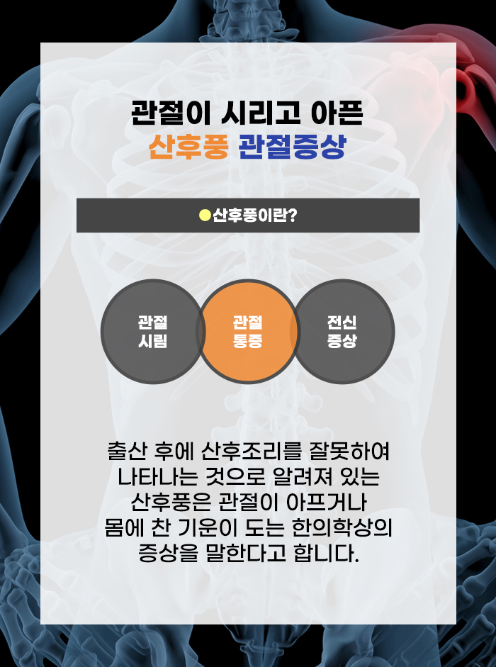 출산 후 관절이 아픈 증상을 두고 산후풍이라고 하는데요. 보통 관절 통증이라고 하면 관절을 무리하게 사용하거나 외상을 입으면서 통증이 생기는 것을 생각하고는 합니다. 하지만 산후풍으로 인한 관절 통증은 특별히 무리하게 관절을 사용하지 않은 상태에서도 생길 수 있습니다. 그리고 뼈에 바람이 들어간 것처럼 시리고 아프다는 점에서 산후풍이라는 이름이 붙게 되었다고 합니다.