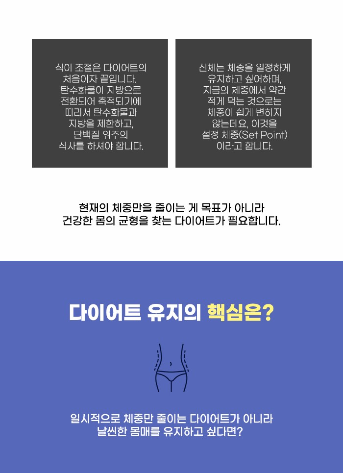 특히 지방 섭취를 아예 하지 않는 다이어트, 야채나 과일 등 한 가지 종류의 음식만 먹는 다이어트를 하는 분도 있는데요. 이렇게 극단적인 다이어트 방법은 영원히 할 수도 없는 것이며, 다이어트를 위해 힘들게 노력하더라도 원하는 체중과 몸 상태를 얻기 힘든 방법이기도 합니다. 내 건강상태와 특징, 다이어트 목표, 현재의 체중과 근육량 등을 살피고,