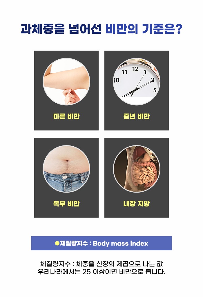 체중을 신장의 제곱으로 나눈 값을 두고 비만을 알아볼 수 있는데요, 우리나라에서는 이 기준이 25라고 합니다. 외국에는 30을 기준으로 두는 경우도 있지만 비만에 취약한 인종의 특징 등을 고려해 우리나라에서는 기준이 25로 정해졌다고 합니다. 그런데 체중이 많이 나간다고 해서 무조건 비만인 것은 아닌데요. 근육이 많아 체중이 많이 나가는 경우에는 비만으로 보지 않습니다.