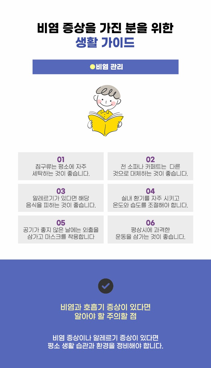 아이의 알레르기 비염 항원을 파악했다면 되도록 알레르기 항원과의 접촉을 줄이는 게 좋은데요. 비염과 호흡기 증상이 있을 경우 알레르기 항원 유무와 상관없이 깨끗하고 정돈된 환경에서 생활하는 것도 중요할 수 있다고 합니다. 그리고 공기가 좋지 않은 날에는 호흡기에 자극이 강할 수 있는데요. 그렇기에 되도록 외출을 삼가는 것이 좋습니다.