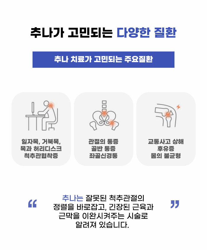 교통사고 같은 외상을 입은 후에 통증이나 후유증을 느끼며 추나를 찾기도 합니다. 또한 다이어트를 하면서 잘못된 자세로 인해 생긴 체형 문제에서 벗어나기 위해 추나에 대해서 알아보는 경우도 있습니다. 성인에게도 바른 자세는 매우 중요하지만, 성장기에 있고 오랜 시간 책을 보며 공부하는 청소년, 어린이에게도 바른 자세는 중요한데요, 그렇기에 건강한 성장을 위해 추나 정보를 찾는 경우도 있습니다.
