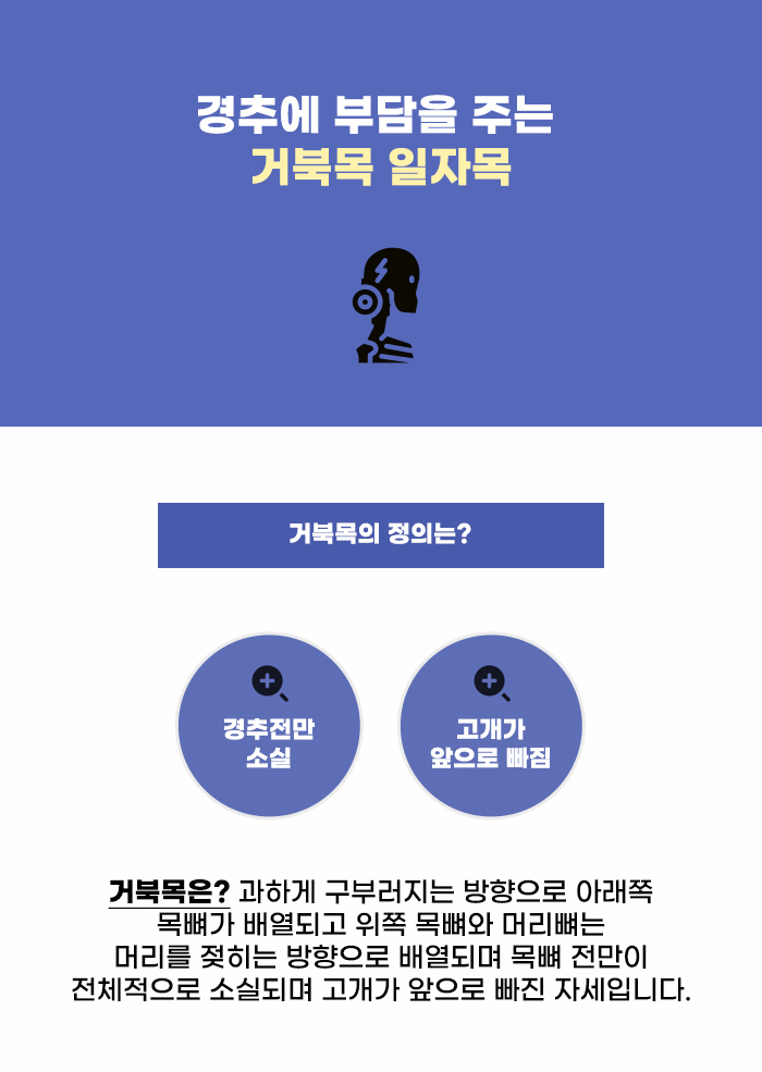 이런 정상적인 곡선 상태를 경추 전만이라고 합니다. 머리는 몸에서 단일 단위로 가장 무거운 부분이라고 하며, 또 목은 머리와 몸을 이어주는 중요한 부분입니다. 신경 다발이 지나는 부분이기도 합니다. 그렇기에 목인 머리를 받쳐주고, 신경 다발을 보호하는 역할을 올바르게 할 수 있도록 곡선 형태를 하고 있는데 이 경추전만 곡선이 빠지고 목을 쭉 뺀 상태가 되는 게 거북목이라고 합니다.