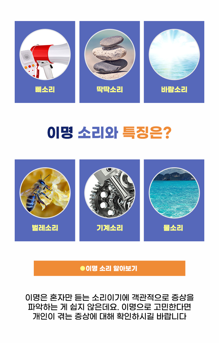 이명은 원인을 추정할 수 있는 경우도 있지만, 그렇지 않은 경우도 있다고 하는데요. 이명 소리를 듣는 분의 경우 벌레 우는 소리를 듣는다고 표현하는 경우도 있으며, 기계음이 반복된다고 표현하는 경우도 있다고 합니다. 또한 종소리를 듣거나, 딱딱하는 소리, 삐소리, 물소리 등을 듣는다고 표현하는 경우도 있다고 합니다.