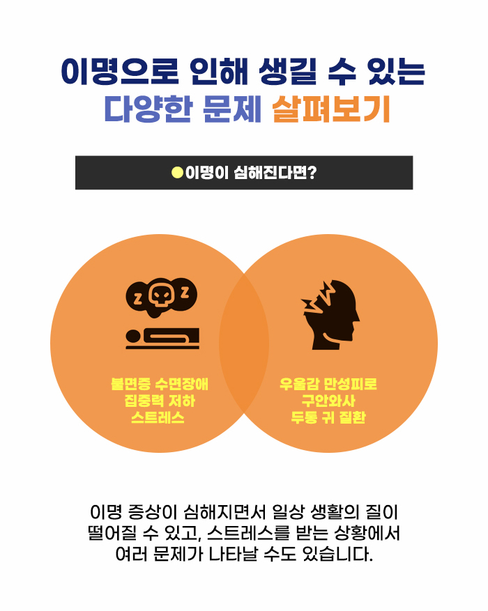 또한 진주이명 정보 고민되는 이명 증상이 반복됨에 따라서 만성 피로, 예민한 신경, 수면 장애 불면증 문제 등이 나타날 수도 있는데요, 지친 상태에서 몸이 약해지고 이명의 원인이 강화될 수도 있습니다. 이런 어려움을 겪는 분은 더욱 이명이 심해질 수도 있기에 주의해야 하겠습니다.
