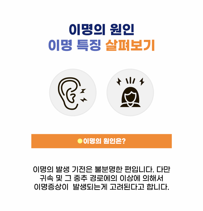외이도의 귀지나 이물로 인해 이명이 들리기도 하며, 외상성 고막천공이나 삼출성 중이염 등으로 인해 저음의 이명 소리를 듣기도 합니다. 그리고 박동성 이명의 경우 중이의 급성 염증으로 나타나는 경우가 있다고 합니다. 노인성 난청, 메니에르씨병, 이경화증, 만성 유착성 중이염 등으로 인해 고음의 이명을 지속적으로 듣는 경우도 있다고 합니다.