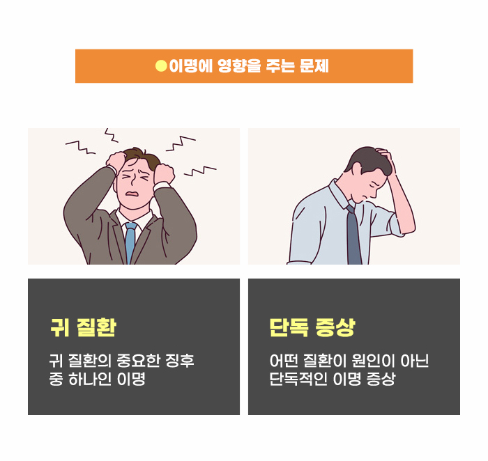 이명은 혼자만 듣는 소리이다 보니 객관적으로 증상을 표현하고, 파악하는 것이 쉽지 않습니다. 그렇기에 현재 이명으로 인해 고민하고 있다면 어떤 소리가 들리는지, 그리고 어느 정도로 소리를 크게 듣는지 확인해야 하는데요, 특정 상황이나 피로가 심할 때 같이 몸 상태에 따라서 이명을 자주 듣는 때가 있는지, 그리고 이명과 동반되는 다른 증상이 있는지도 파악해야 하겠습니다.