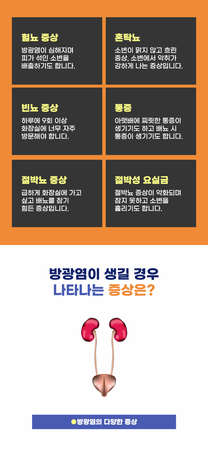 갑자기 소변이 마려워지거나, 너무 자주 화장실에 가야 하는 경우 아무래도 사회생활을 하면서도 불편함을 겪을 수 있는데요, 직장 업무 때문에 바쁜 상황에서 불편함이 생기기도 하고 오래 앉아있어야 하는 영화관 방문이나 고속버스를 타는 게 힘들 수 있습니다. 많은 분이 겪는 배뇨 이상 증상의 원인으로 방광염을 들 수 있다고 합니다.
