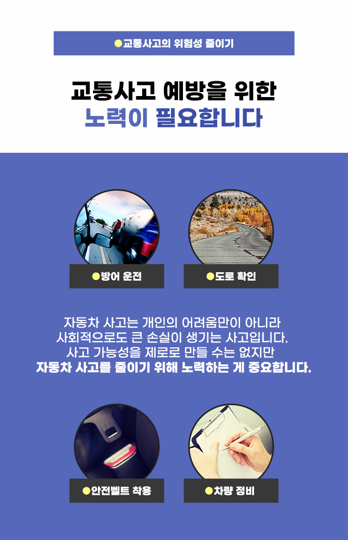 현대 사회에서 늘 사람들의 안전을 위협하는 사고가 바로 교통사고가 아닐까 합니다. 차량은 사람들의 곁에 늘 있는 존재인데요, 그만큼 편리함도 크고 우리나라의 산업 발전에서 차량은 중요한 역할을 해오기도 했습니다. 하지만 차의 존재로 인해 편리함도 크고, 인간의 삶에 기여하는 바도 크지만, 차량으로 인한 폐해도 존재합니다.