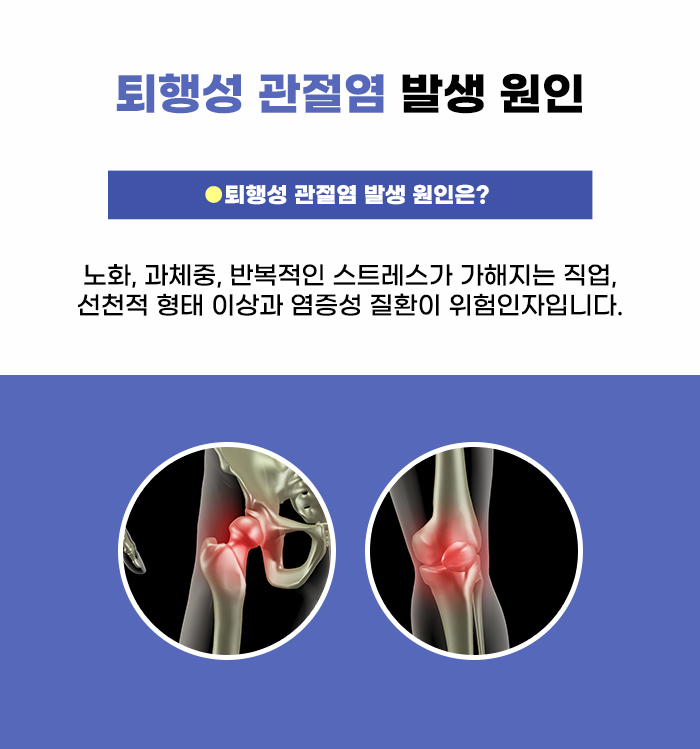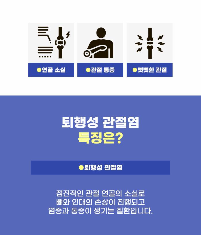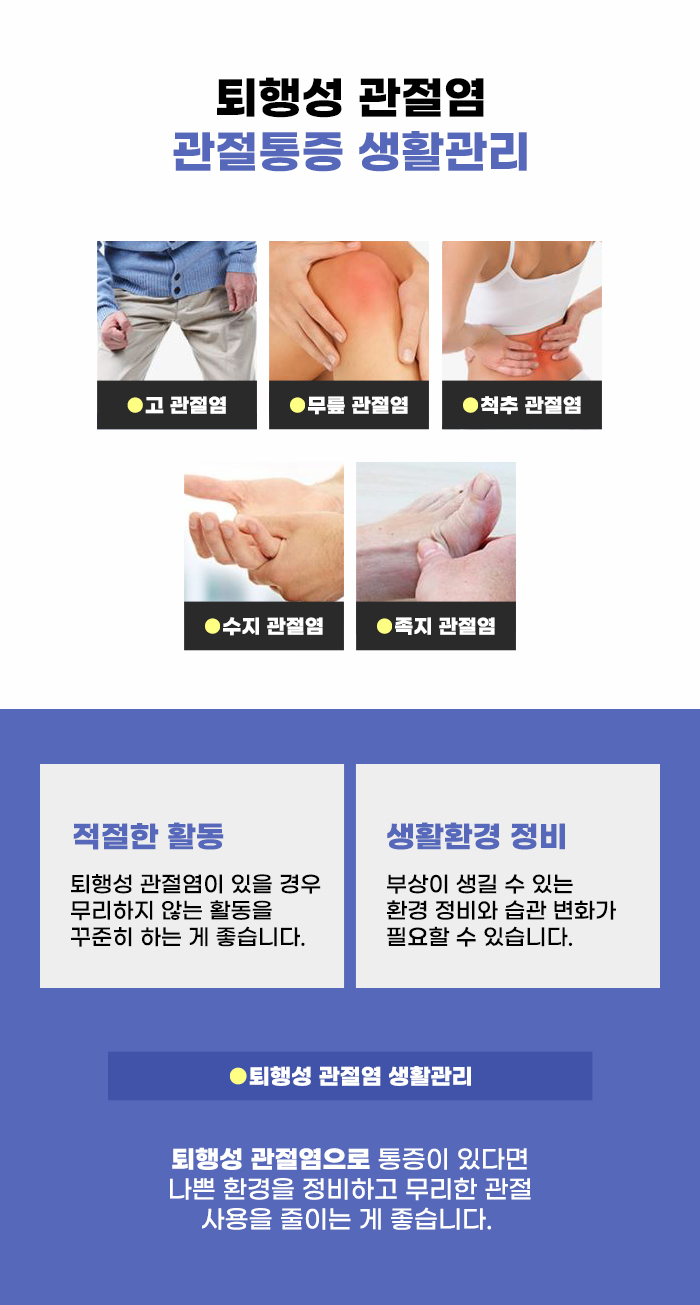그리고 좋은 습관을 가지기 위해 힘썼으면 합니다. 관절 질환 중 가장 흔히 발생하고, 많은 분이 고민하는 질환이 바로 퇴행성 관절염이라고 합니다. 이 퇴행성 관절염은 관절 연골이 소실되고, 뼈의 손상, 염증, 통증이 생기는 질환이라고 합니다. 노화로 인한 신체의 퇴행성 변화가 주된 원인이라고 하지만 잘못된 습관과 무리한 활동도 퇴행성 관절염의 발생에 영향을 준다고 합니다.