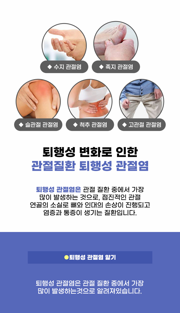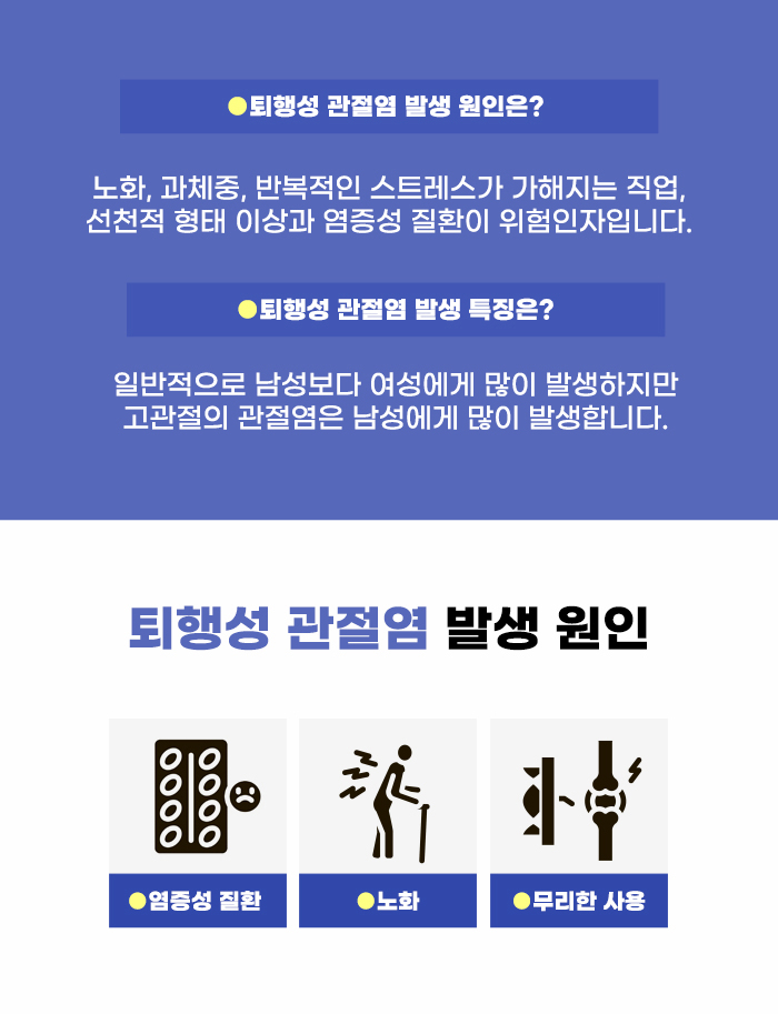 뼈가 직접 부딪혀 상하지 않게 부드러운 연골이 관절에 존재하는데요. 이 연골이 무리한 사용, 노화, 퇴행성 변화 등으로 인해 영향을 받아 소실되고 염증, 통증이 관절에 생기는 게 퇴행성 관절염이라고 합니다. 관절 질환 중 매우 흔한 질환이며 고령층만의 전유물이 아니기에, 현재 나쁜 자세와 통증이 있다면 관절 문제에 대해서도 꼼꼼히 체크하셨으면 합니다!