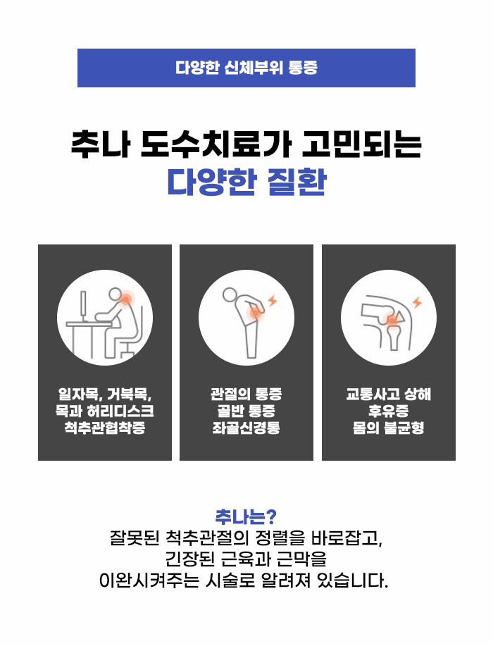 또한 취미생활도 영상 보기, 게임 등을 많이 하게 되면서, 여가 시간에도 의자에 앉아 시간을 보내는 어린이 청소년이 많습니다. 성인이 되어서도 이런 생활이 이어지면서 일명 '의자병'이라고도 하는 문제로 고통받고 있다고 합니다. 추나는 잘못된 몸의 균형을 다시 찾는 데 도움을 주는 방법으로 알려져 있다고 하는데요, 오래 잘못된 자세로 앉아있으면서 생기는 각종 질병과 통증, 피로 등에 시달리고 있다면 참고하셨으면 합니다.