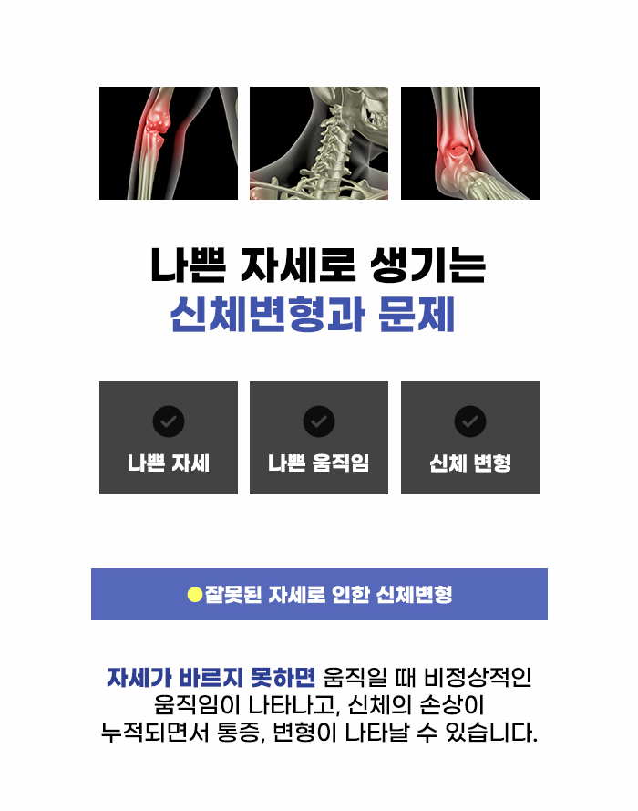 나쁜 자세는 나쁜 움직임을 불러오게 되는데요, 잘못된 활동을 오래 지속할 경우 신체를 구성하는 근막, 근육, 인대 등 신체 구조물의 변형이 발생하게 될 가능성이 커집니다. 이렇게 신체 구조물의 변형이 생길 경우, 다시 나쁜 자세를 하기 더 쉬워지게 됩니다. 나쁜 움직임이 생기며, 신체 구조물의 변형이 더 심해지는 등 악순환이 생길 수 있다고 합니다.