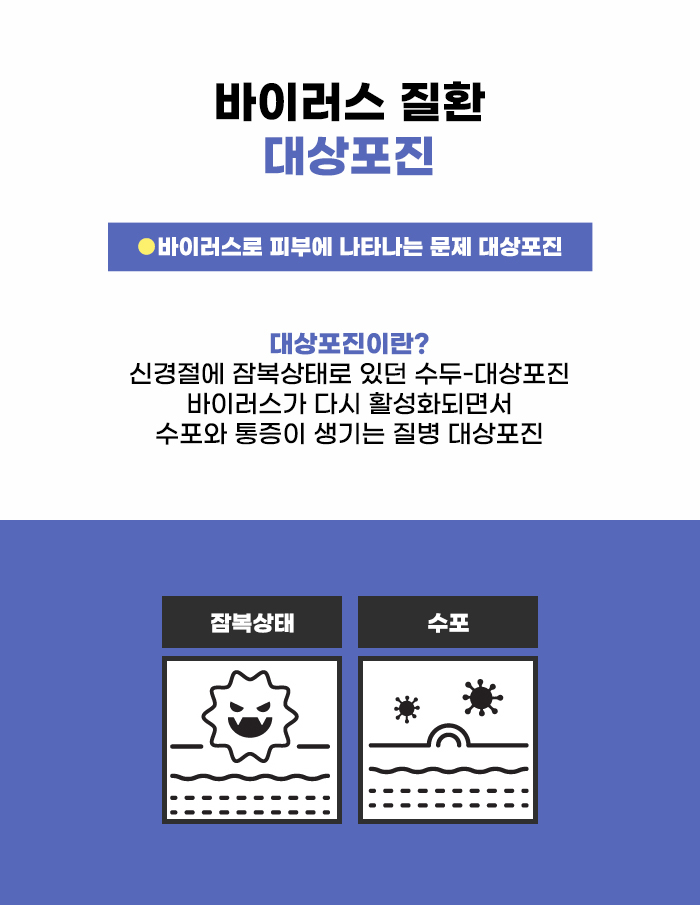 어릴 적 많은 분이 수두를 앓았을 것인데요. 이렇게 수두를 앓고 난 후에 이 바이러스가 완전히 사멸되어 사라지는 게 아니라 몸에 잠복 상태로 존재할 수 있다고 합니다. 신경절에 잠복하여 있던 바이러스는 몸이 건강할 때는 드러나지 않을 수 있는데요, 하지만 몸이 약해진 상태에서 여러 요인이 작용하면서 대상포진 바이러스가 활성화될 수 있다고 합니다.