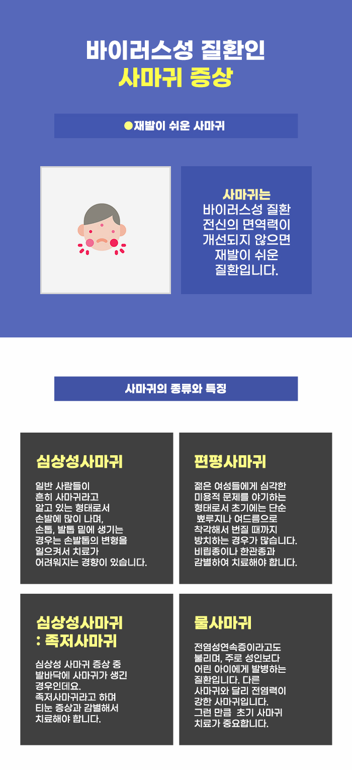 그리고 수포가 피부에 생기다 보니, 잘 알지 못하는 상태에서 '피부질환'으로 생각하는 경우도 있다고 합니다. 하지만 대상포진은 단순히 피부 부분에만 국한된 질환이 아니며, 바이러스성 질환이라는 특징이 있는데요. 그렇기에 이 점을 고려해 대처해야 하겠습니다. 바이러스성 질환이며 피부에 병변이 나타나는 질환으로 사마귀를 들 수 있다고 합니다.