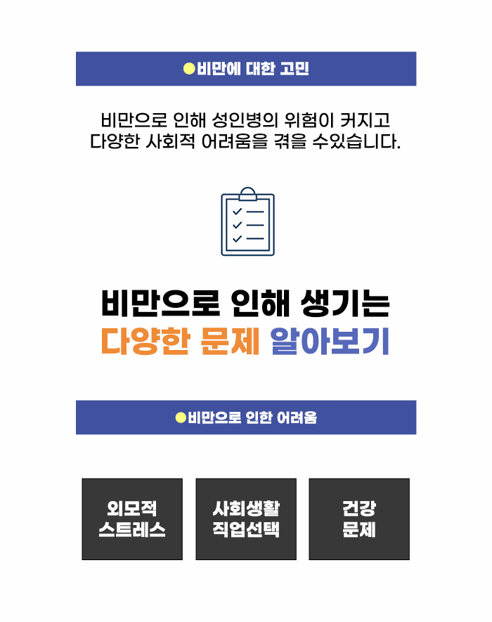 또한 비만에 대한 잘못된 생각이 더해지며, 사회적인 어려움을 겪기도 합니다. 다른 사람으로부터 게으른 사람이라는 오해를 받거나, 무조건 절제가 부족하다는 오해를 받기도 합니다. 비만의 원인은 다양하며 꼭 개인의 의지 문제만 비만에 영향을 주는 것은 아니라고 합니다. 또한 실제적 어려움도 있는데요, 살이 많이 찌면서 맞는 옷을 찾기 힘들고, 일상생활에서도 몸이 무거워 불편해지기도 합니다.
