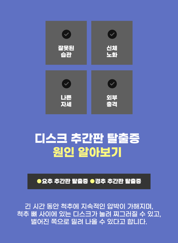 잘못된 자세를 오래 유지하고, 지속적으로 척추의 압박을 받는 게 추간판 탈출증 발생의 이유가 될 수도 있다고 합니다. 그리고 추간판 탈출증 발생에 영향을 미치는 다른 요인으로 교통사고와 같이 충격이 전달되는 외상을 입은 후에 영향을 받을 수도 있다고 하며 퇴행성 변화, 노화에 의해서 추간판 탈출증이 악화되기도 합니다.