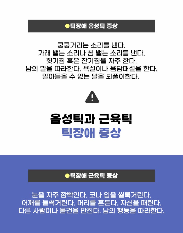 그리고 소리를 내는 것을 두고 음성 틱이라고 하는데요. 가벼운 헛기침 소리나 혀를 차는 소리를 내는 경우도 있지만, 다른 사람의 말을 따라 하는 증상, 알아들을 수 없고 의미도 없는 말을 되풀이하는 증상 등이 있는 경우도 있습니다. 그리고 욕설을 하거나 음담패설을 하는 경우도 있다고 합니다. 또한 음성 틱과 근육 틱이 복합적으로 나타나고, 유병 기간이 1년 이상이 되면 뚜렛증후군이라고 합니다.