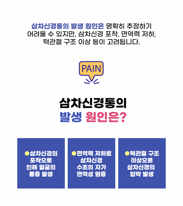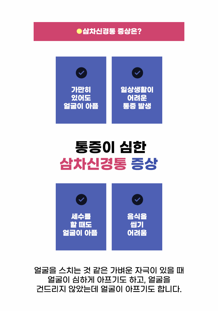 실제로는 몸에 해가 갈만한 자극이 주어지지 않았는데도, 얼굴이 아파지는데요. 그렇다 보니 삼차신경통이 심한 분은 세수하거나 화장, 면도를 하는 것 같은 일상생활도 통증을 견디며 해야 하는 어려움이 생길 수 있다고 합니다. 나에게 소중한 얼굴에 이상이 생길 경우 올바른 관심을 갖고 충분한 휴식 시간을 가졌으면 합니다!