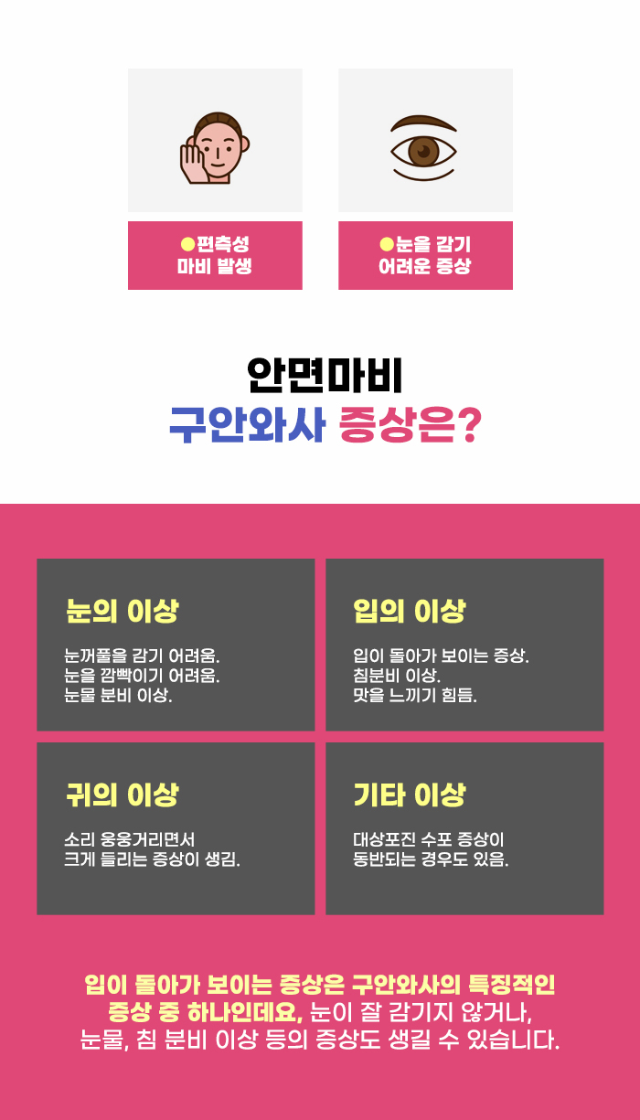 안면 신경마비가 생길 경우, 이마에 주름을 잡을 수 없거나, 눈이 잘 감기지 않는 것 같은 증상이 생기게 되는데요. 얼굴이 마비되면서 여러 문제를 함께 겪을 수도 있다고 합니다. 현재 진주안면마비 정보 알고 싶은 분이라면 이 페이지를 통해 구안와사, 그리고 구안와사와 함께 올 수 있는 대상포진과 얼굴에 생기는 통증 문제 등의 정보를 알 수 있었으면 합니다.