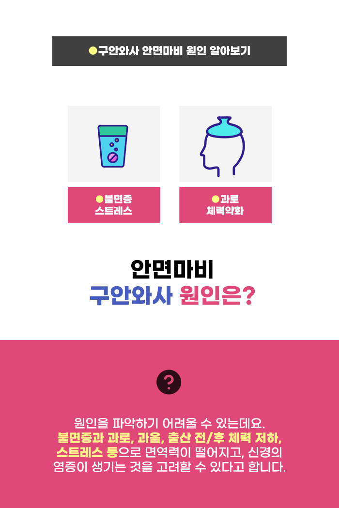 구안와사 문제가 생기는 이유는 아직 밝혀지지 않았다고 합니다. 다만 여러 요인을 고려해서 생각해 볼 수 있다고 하는데요. 면역력 저하로 인해 안면신경의 염증이 쉽게 생기는 상태가 될 수도 있다고 알려져 있습니다. 그렇기에 신체의 면역력이 갑자기 떨어지는 상황에 주의해야 하는데요, 과로, 반복되는 불면증과 수면 장애, 임신과 출산으로 인한 체력 저하, 심각한 스트레스 등도 진주안면마비 문제를 불러오기도 합니다.