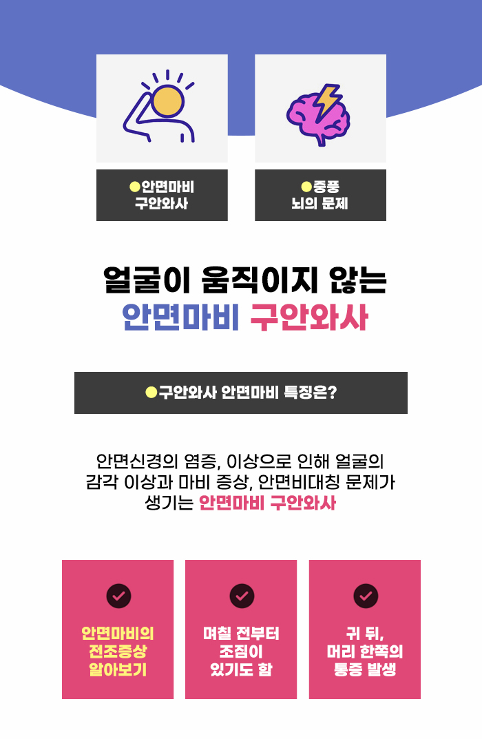 특히 얼굴 마비 증상은 뇌경색, 뇌출혈 같은 뇌의 문제, 중풍과 연관되어 생기는 경우도 있다고 합니다. 중풍, 뇌경색 문제가 생길 경우 얼굴 마비만으로 끝나지 않고 언어 장애, 반신 마비, 보행 장애 등의 문제가 생길 수도 있고, 생명에 큰 지장이 생길 수도 있습니다. 그렇기에 마비 증상이 갑자기 나타났다면, 안면마비 원인에 대해서 빠르게 파악해야 합니다!