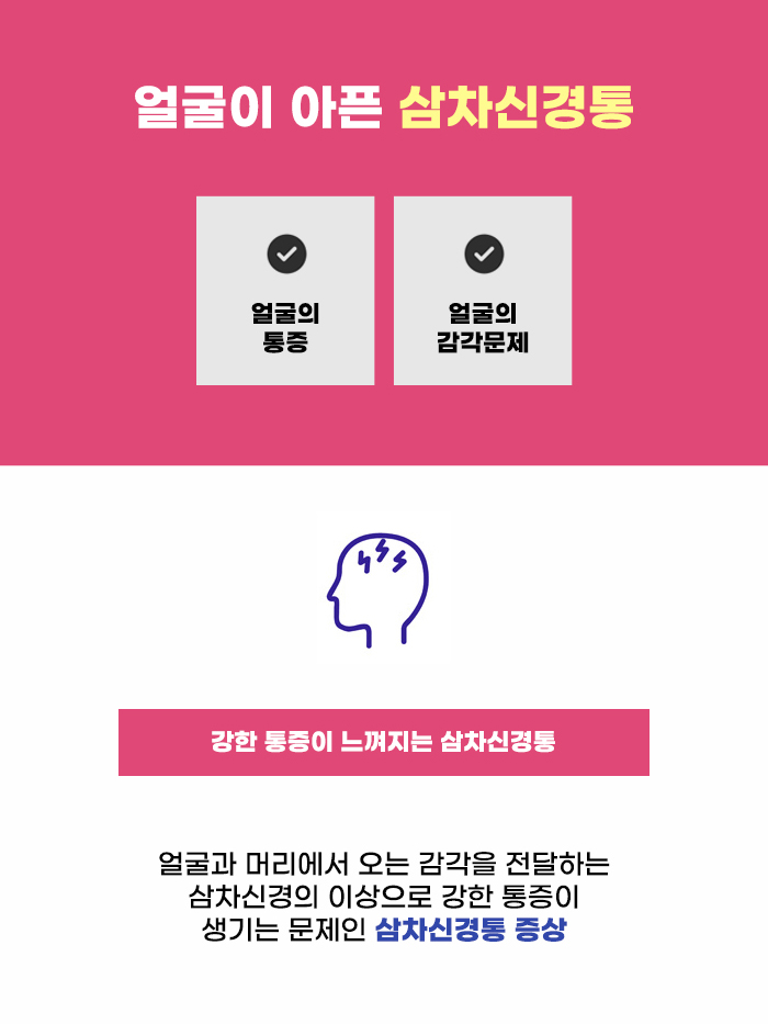 얼굴의 감각 문제, 표정을 짓기 힘든 문제가 생기는 구안와사와 차이가 있지만, 마찬가지로 얼굴 부분에 생기는 고민 질환이 있는데요. 바로 삼차신경병증이라고 합니다. 삼차신경의 문제로 인해 얼굴과 머리의 감각이 뇌로 정상적으로 전달되지 못하고, 작은 접촉에도 얼굴이 아픈 특징이 있습니다.