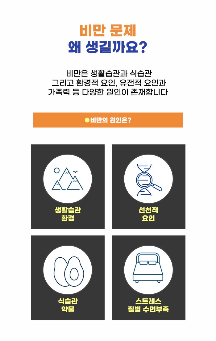 하지만 음식을 언제든지 풍족하게 먹을 수 있고 특히 고칼로리의 탄수화물, 튀김 음식, 단 음식을 누구나 쉽게 구할 수 있는 현재는 효율적인 몸 상태로 인해 더 쉽게 비만이 될 수 있게 된 것인데요. 그렇다 보니 현대에 많은 분이 비만으로 인해 어려움을 겪고 있다고 합니다. 특히 중년의 나이가 되면서 비만 고민이 더 커질 수 있습니다.