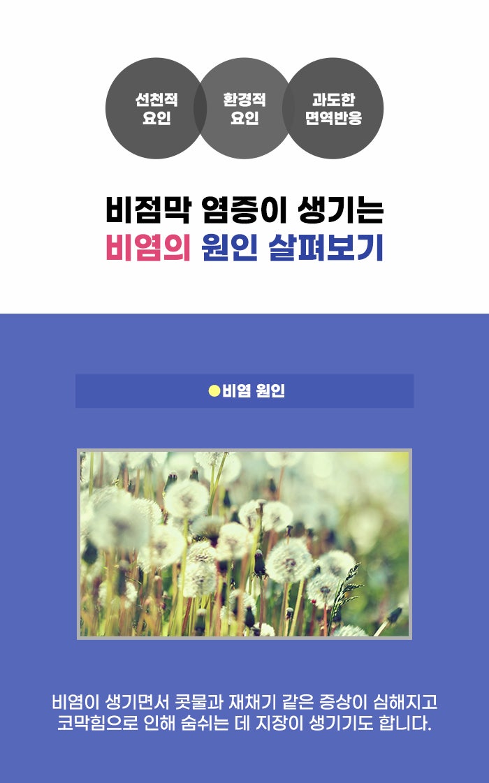 예를 들어서 비염 유형 중 알레르기성 비염이 있는데요, 알레르기란 원래는 인체에 해를 가하지 않는 물질에 과도하게 몸이 반응하며 문제가 생기는 것을 말합니다. 이 알레르기 비염의 원인 항원은 먼지, 진드기, 강아지 등 동물의 털 같이 다양한데요. 특히 꽃가루로 인해 알레르기성 비염이 생기는 경우가 많다고 합니다.