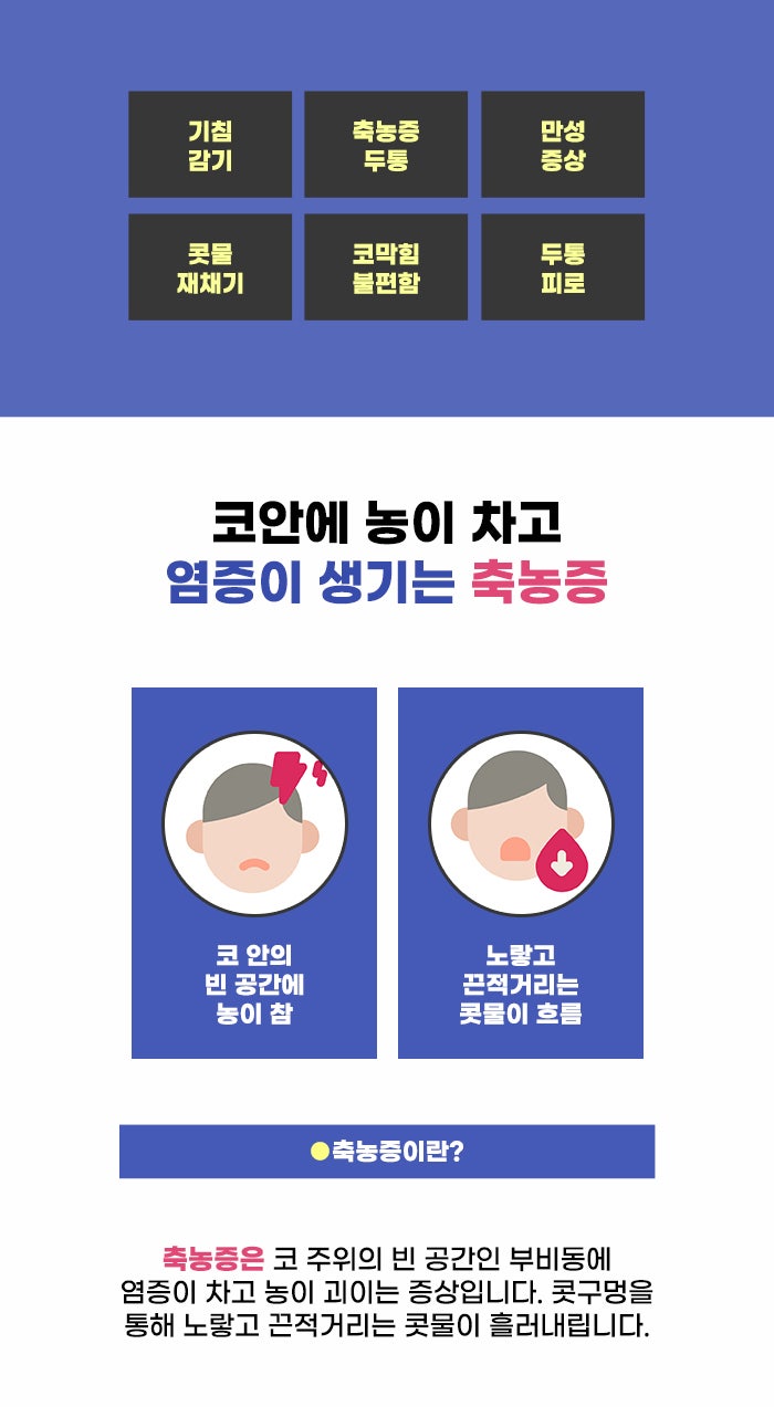 숨을 쉬는 중요한 통로인 코는 바로 몸 안으로 이어지는 부분이기도 합니다. 그렇다 보니 이 부분을 지키고, 호흡기를 보호하기 위해 이물질을 거르고 배출하는 여러 장치가 있는데요. 콧물도 그중 하나입니다. 코안의 이물질, 머리뼈 안쪽 부비동의 분비물, 등을 배출하는 콧물은 필요한 경우 적절히 분비가 되어야 하는데요. 그런데 비정상적으로 콧물이 많이 흐르고 코안이 부어오르며 막힐 경우 숨을 쉬는 데 오히려 지장이 생기게 됩니다.
