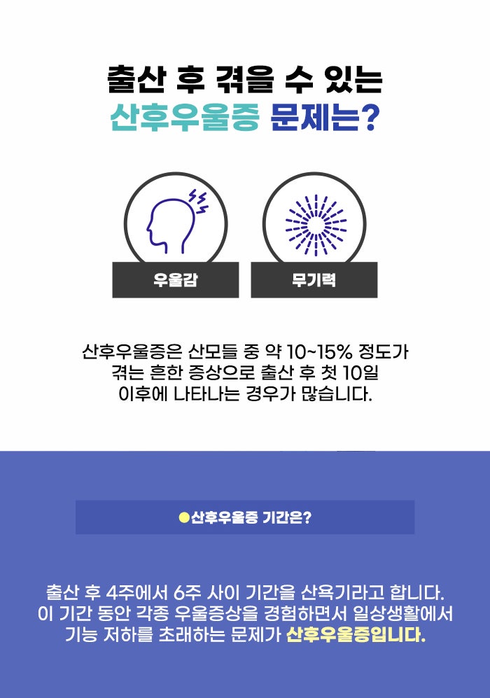 출산 후 산욕기는 4주에서 6주 사이 기간을 말하는데요. 이 동안 불면증이나 과도한 체중 변화를 경험하고, 우울한 기분이나 심한 불안감을 느끼는 경우 산후 우울증에 대해서 생각해 봐야 할 수도 있습니다. 집중력이 떨어지거나 의욕이 떨어지는 경험을 하기도 하고, 자기 자신에 대해서 가치가 없다고 생각하는 경우도 있습니다.
