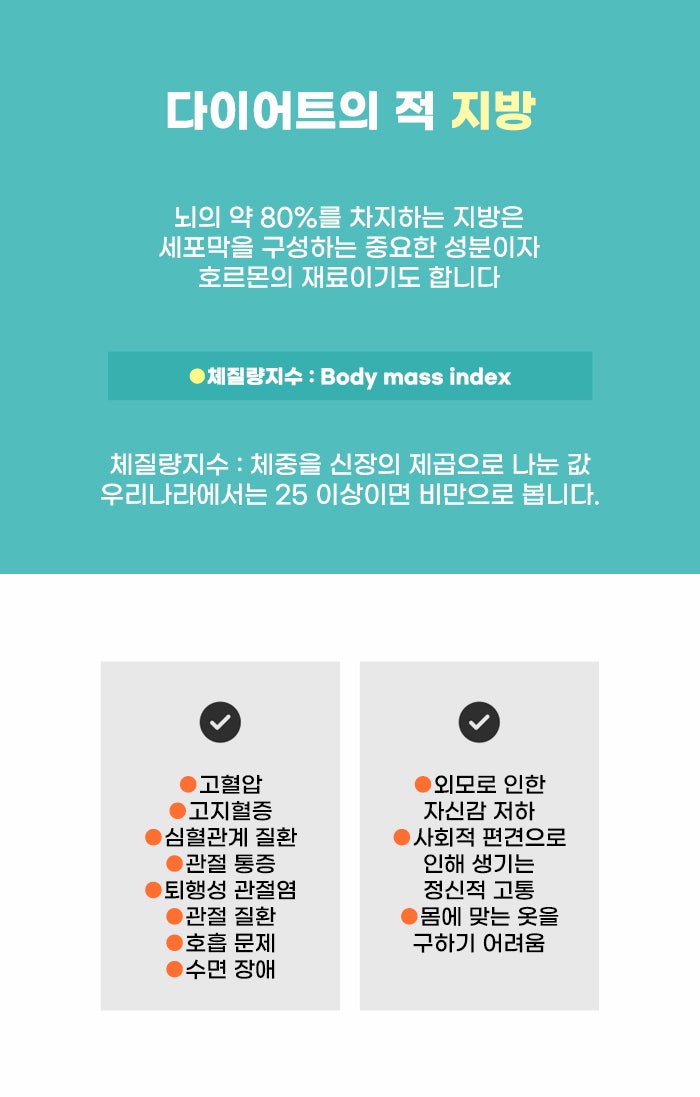 지방은 인체의 구성 성분이자, 중요한 에너지원이라고 하며, 뇌를 구성하는 중요한 물질이기도 합니다. 하지만 현대는 이런 긴 시간 동안 인류가 살아온 모습과 달라졌는데요. 많은 사람이 음식을 풍족하게 구할 수 있게 되고, 필요한 것 이상으로 음식을 먹을 수 있게 되었습니다. 그렇다 보니 몸에 필요한 정도가 아니라 지나치게 많은 지방이 축적되어 고민하는 분이 늘고 있습니다. 일정 기준 이상 지방이 늘어나면 과체중, 그리고 그 이상일 경우 비만, 고도비만이라고 합니다.