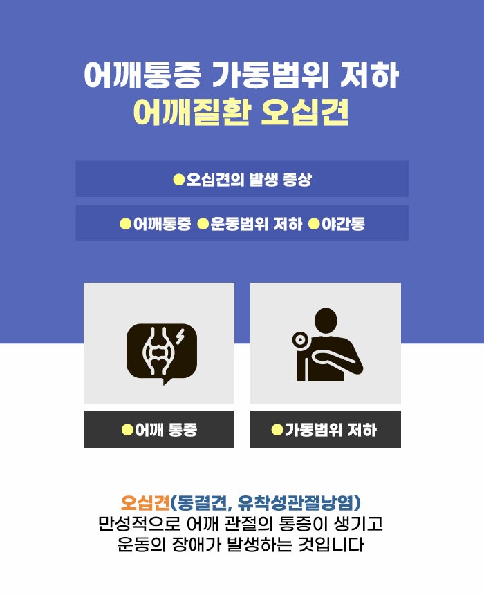 바로 오십견인데요. 진주시 한의원 유명한곳 정보 고민되는 오십견은 어떤 문제일까요? 오십견은 동결견이라고도 불리는데 어깨가 얼어붙은 것처럼 움직이지 않는다는 의미에서 이런 별명이 붙게 되었다고 합니다. 어깨를 움직이는 관절을 싸고 있는 관절낭이라는 부분이 있는데요. 이 부분에 유착이 생기면서 어깨 통증과 함께 어깨의 수동적, 능동적 움직임이 모두 제한된다고 합니다.