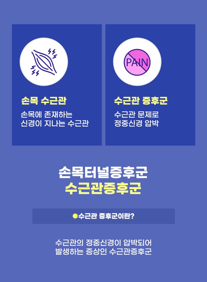 수근관이 좁아지면서 손목이 아프고 손가락이 저린 질환을 두고 수근관증후군, 혹은 손목터널증후군이라고 부릅니다. 엄지와 둘째, 셋째 손가락이 저리고 무감각해지는 증상이 가장 흔한 편이라고 하는데요, 엄지 두덩 부분이 뻐근한 통증이 생기기도 하고 팔과 어깨 통증이 생겨 고민하는 분도 있다고 합니다. 또한 야간에 이런 통증이 더 심해지는 분도 있습니다.