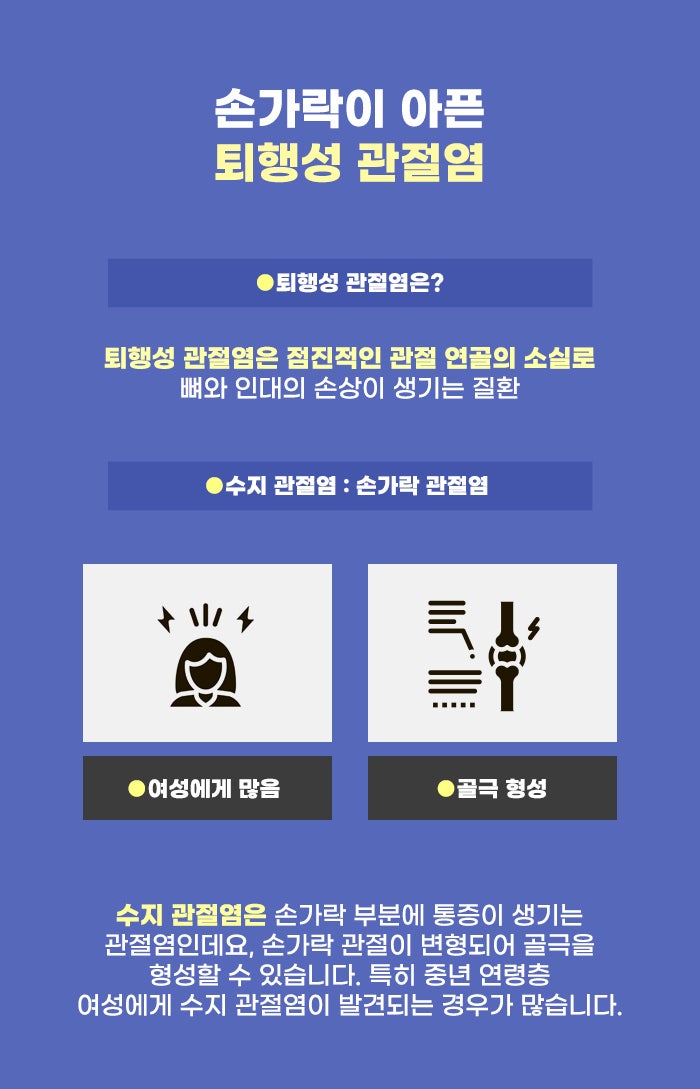 수근관증후군은 상지에서 흔한 통증 질환이라고 하는데요. 여러 관절 부위에 나타날 수 있고 가장 흔한 관절 질환으로 꼽히는 것이 퇴행성 관절염이라고 합니다. 수근관증후군이 여성에게 많은 것처럼, 퇴행성 관절염 수지 관절염 역시 중년 여성에게 더 많은 편이라고 합니다. 현재 손가락이나 손목, 손이 아픈 중년 여성이라면 참고하셔서 통증의 원인을 알아보셨으면 좋겠습니다.