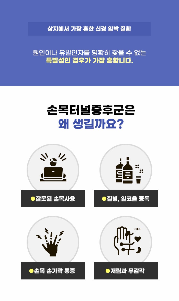 또한 고개를 푹 숙이고 모니터를 오래 보다 보면 목에 부담이 가면서 경추 추간판 탈출증 문제가 발생할 가능성, 거북목과 만성통증이 발생할 가능성도 있다고 합니다. 키보드와 마우스를 사용하면서 손목에 부담이 생기게 되고 손목터널증후군이나 만성 통증, 저림 등으로 걱정하는 분도 있는데요. 현재 손목과 손가락 통증이 염려되는 분이라면 이 페이지를 통해 손목터널증후군에 대해서 알아보셨으면 합니다.