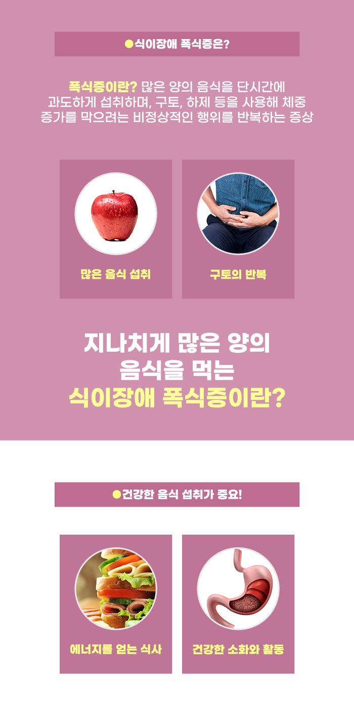 폭식증의 경우, 짧은 시간에 많은 양의 음식을 먹는 것, 그리고 이 먹은 음식을 제대로 소화시키는 게 아니라, 일부러 구토를 하거나 하제를 오용해 설사를 하는 문제라고 하는데요. 구토를 한 뒤에 먹고 다시 구토를 하는 증상을 보이기도 합니다. 음식을 조절하기 어렵다는 것을 남들에게 알리고 싶지 않아 혼자 있을 때만 몰래 구토를 한다는 분이 많습니다.