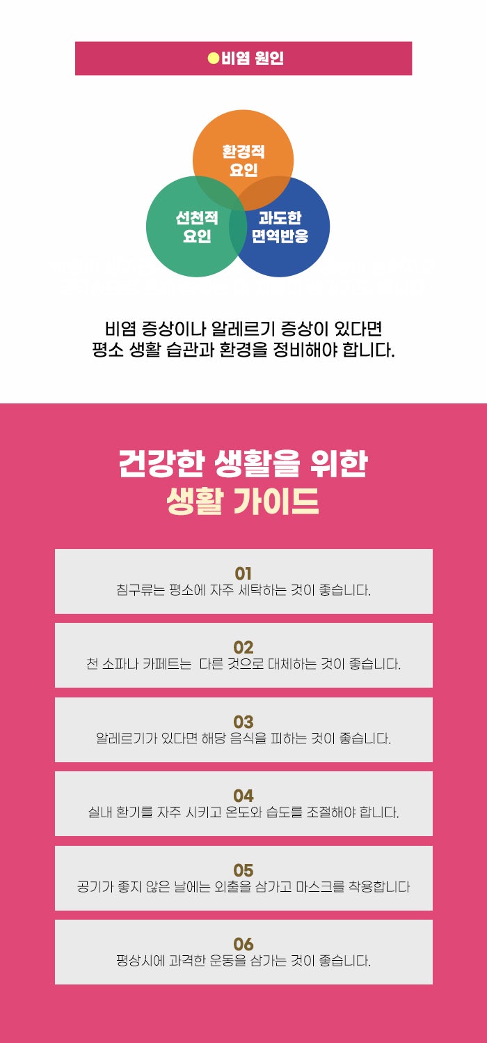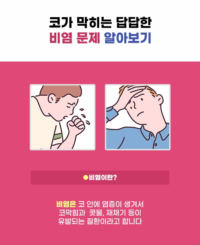 그리고 답답하고 불편한 것을 넘어서서 숨이 막히면서 생명과 건강에 치명적인 위협이 생길 수도 있다고 합니다. 사람은 물을 마시지 못하거나 음식을 먹지 못하는 상황에서도, 상당히 긴 시간 동안 생존할 수 있다고 하는데요. 숨을 쉬지 못하는 상황에서는 단 1분, 2분 만에 위험한 상태가 될 수도 있습니다. 그렇기에 호흡을 잘하는 것은 누구나 중요하다고 알고 있는데요. 재채기나 기침이 생기고, 숨을 쉬는 통로인 코가 막히는 증상이 특징인 질환이 바로 비염이라고 합니다.