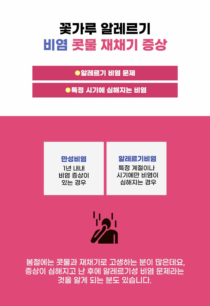 하지만 봄철에 유독 콧물, 재채기 증상과 코막힘 증상이 심해서 봄이 반갑기만 한 것은 아니라는 분도 있습니다. 이런 증상이 있을 경우 꽃가루 알러지 등으로 인한 비염 증상을 고려해 볼 수도 있다고 합니다. 비염 증상이 한 계절에만 있는 게 아니라 사계절 내내 있을 경우 만성 비염으로 보기도 하는데요, 비염의 분류, 정의는 명확하게 나누기는 어려울 수도 있다고 합니다.