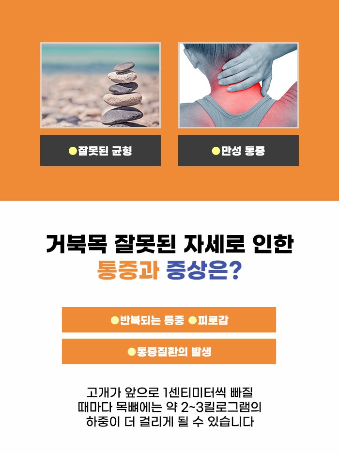 원래 있어야 하는 자리를 벗어나, 곡선이 소실되고, 고개가 더 앞으로 빠질 때마다 목에 더해지는 하중이 커진다고 하는데요. 1cm 정도에 2~3킬로그램 정도 더 부담이 커질 수도 있다고 합니다. 거북목 문제가 심해지면서 목에 더해지는 하중은 더 커질 수도 있는데요. 거북목으로 인해 목에 최대 약 15킬로그램까지도 부담이 커진 상태가 될 수도 있다고 합니다.