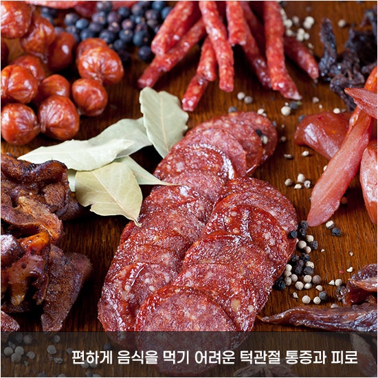 단단한 음식, 질긴 음식으로는 고기류, 말린 음식 등이 있습니다. 그런데 이런 음식을 좋아하고, 즐겨 먹는다면 주의해야 하는 게 있는데요. 바로 턱을 사용하기 어려운 턱관절 장애입니다. 단단하고 질긴 음식을 자주 드시는 편이라면 턱관절의 부담이 평소 커져 있는 상태일 수도 있습니다.