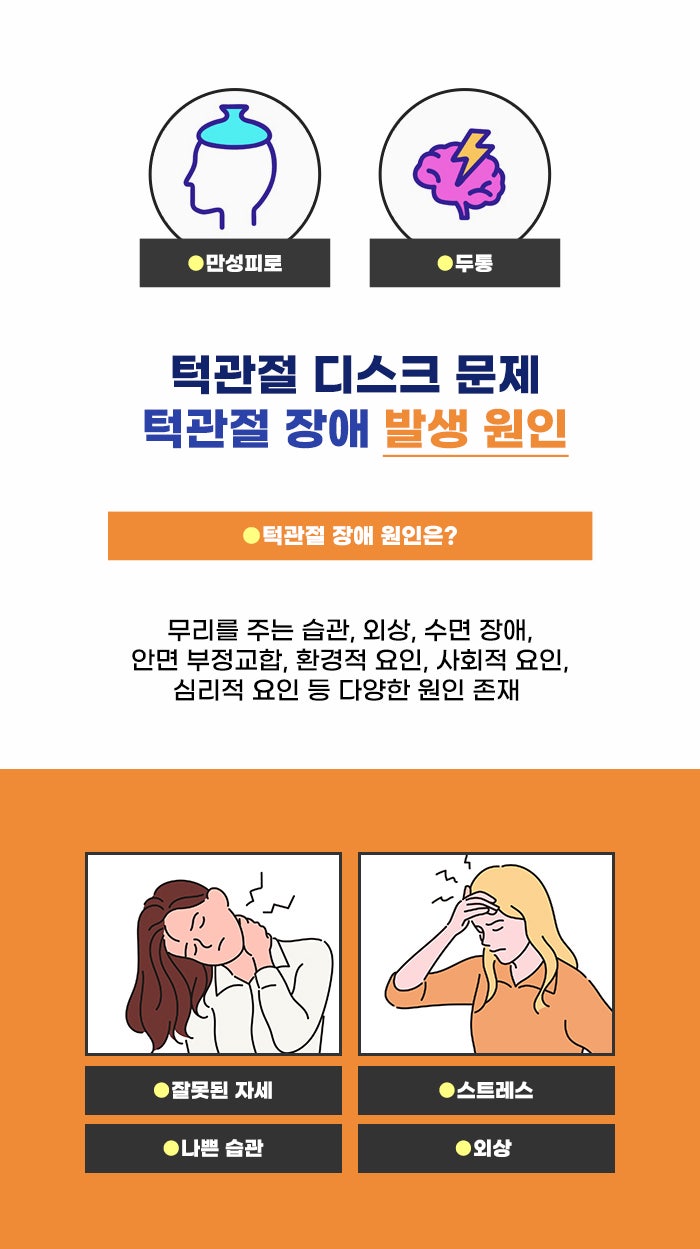 뼈와 뼈 사이에서 쿠션과 비슷한 역할을 하는 디스크나, 턱을 둘러싼 근육과 뼈, 관절 등에 이상이 생기고 배열에 문제가 생기면서 진주턱관절치료한의원 '딱'소리가 나는 증상이 생기기도 하는데요. 이런 문제가 생기면서 턱관절이 본래 해야 하는 역할을 하는데 지장이 생기는 경우 '턱관절 장애'라고 생각할 수도 있습니다.