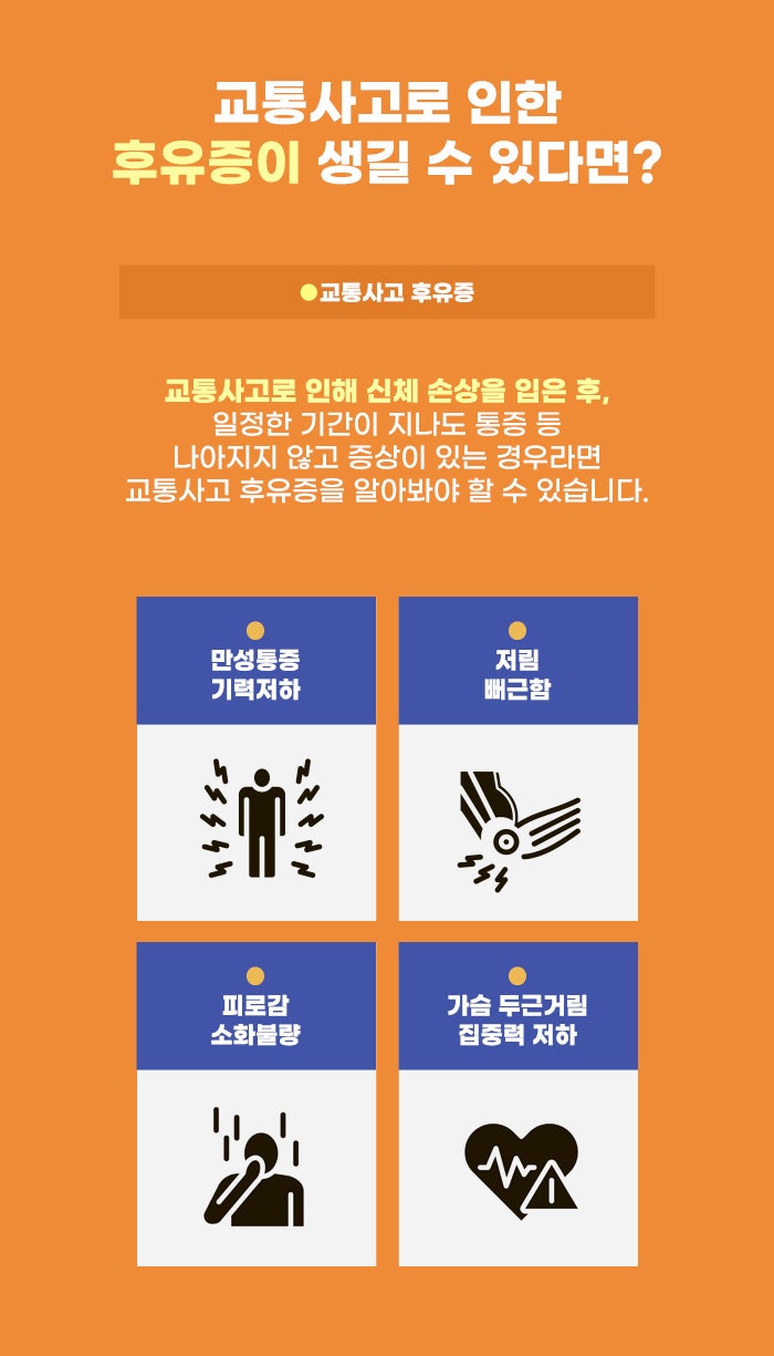 교통사고를 겪었을 때 몸이 흔들리고 목이나 허리가 꺾이기도 하는데요. 이런 이유로 척추에 부담이 가게 되면서 외상으로 인해 추간판 탈출증 발생 위험이 커질 수도 있습니다. 또한 사고 충격으로 몸이 긴장되고 균형이 흐트러진 상태가 이어지며, 만성 통증, 척추 질환의 위험이 커질 가능성도 있다고 하니 참고하셨으면 합니다.