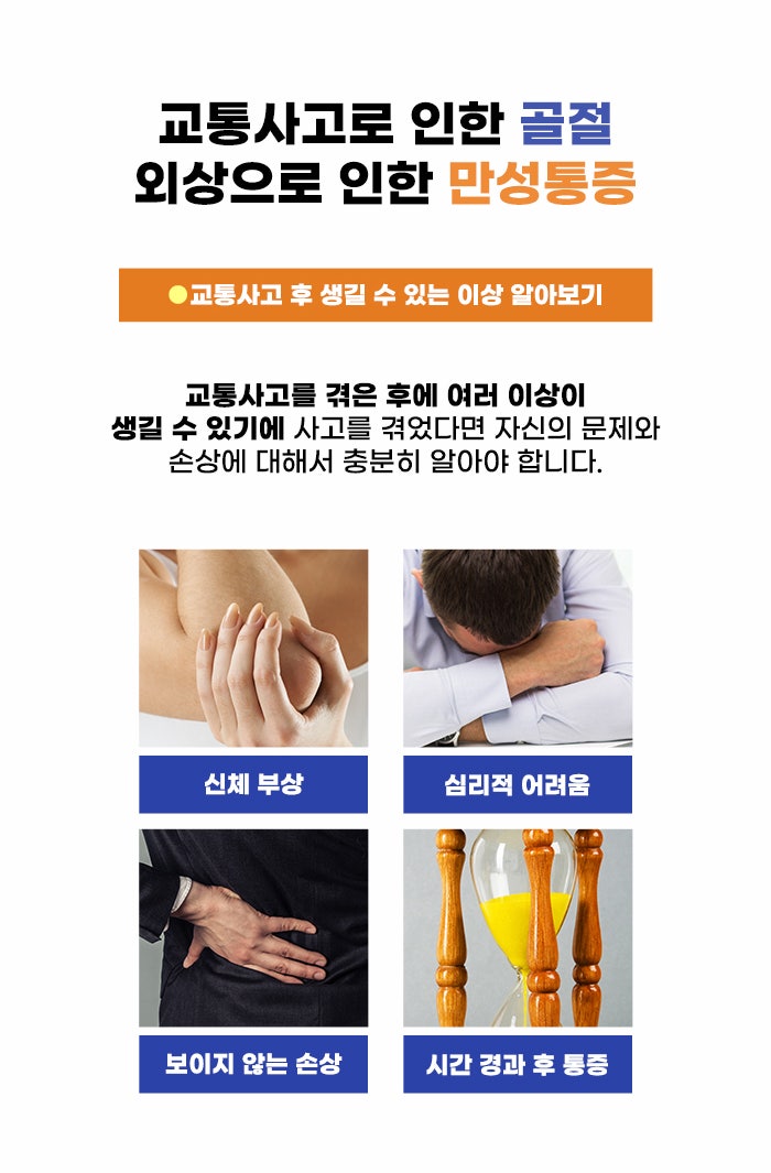사고를 당한 모든 사람이 동일한 정도의 손상이 생기는 것은 아닌데요, 사고 당시 상황, 좌석 위치 등에 따라서 생기는 부상 정도, 고민되는 통증 정도는 다를 수 있습니다. 그리고 뼈가 약해지는 골다공증 등의 건강 문제를 갖고 있는 분의 경우 다른 사람에게는 이상이 없어도 골절 같은 큰 부상을 입기 쉬울 수도 있다고 합니다. 그렇기에 평소 자신의 몸 상태를 이해하고 건강한 몸 상태를 유지하기 위해 노력하셨으면 합니다.