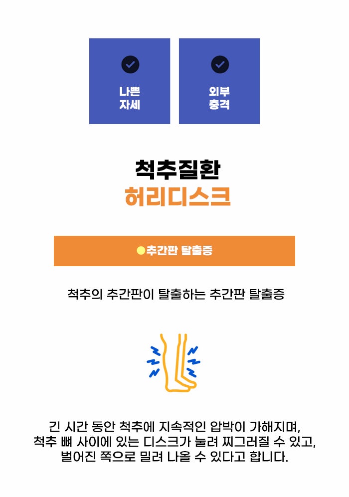 자동차 사고로 인해 영향을 받을 수 있는 여러 문제를 알아보자면 디스크가 있다고 합니다. 디스크는 원래 척추의 추간판을 영어로 부르는 말이라고 하는데요. 척추에 강한 부담이 주어지며 추간판이 밀려 나오고 신경근 자극, 염증, 통증 등의 문제가 생기는 게 추간판 탈출증입니다. 흔히 간단히 줄여서 허리 디스크, 목 디스크 등으로 부릅니다.