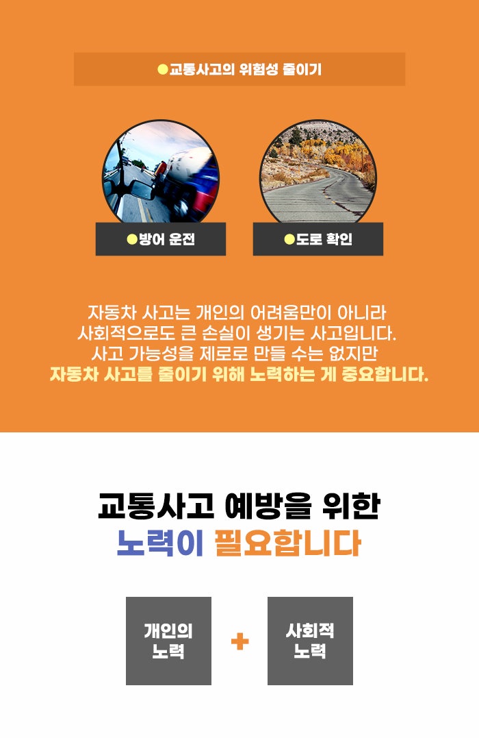 우리나라에서는 하루에도 여러 건의 교통사고가 일어나고 있습니다. 세계적으로 보면 자동차 사고 부상 환자는 1년에 약 오천만 명 이상이라고 합니다. 그리고 사망 사고 문제는 1년에 약 135만 명 정도가 교통사고로 인해 사망한다고 합니다. 이렇게 많은 사고가 일어나고 있지만, 한 개인으로서는 사고에 대해 잘 모를 수 있겠습니다.