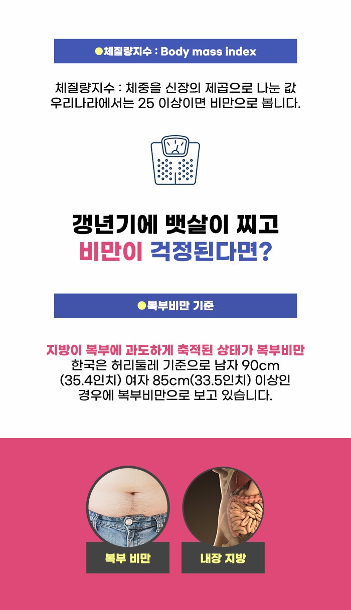 그런데 복부비만, 그중에서도 특히 체강 내 지방이 쌓이는 내장지방형 비만인 분의 경우, 비만의 합병증 위험이 더 클 수도 있다고 합니다. 체강은 체내 장기를 덮고 있는 부분입니다. 내장지방이 많은 유형인 경우 비만 합병증 위험이 높아지게 된다고 합니다. 그렇기에 비만 분 중에서 배가 많이 나온 분이라면 더욱 경각심을 가지고 진주 갱년기 다이어트 위해 노력하는 게 필요하겠습니다.
